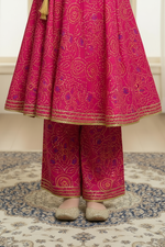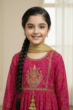Paired with printed wide leg trousers with lace on the hem and Masoori crush dupatta.