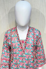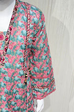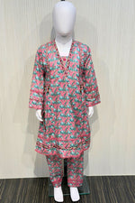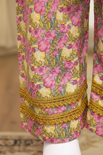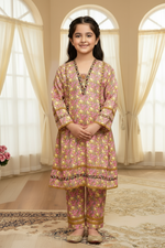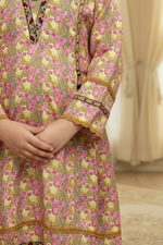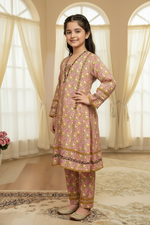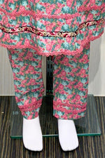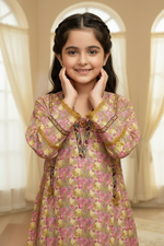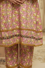 PRODUCT DESCRIPTION: 2 Piece Suit Frock style A-line shirt with embroidered lace on the neck and embroidered lace on the daman. Tessels attached on both sides of the front. Paired with printed trousers and lace on the hem.
