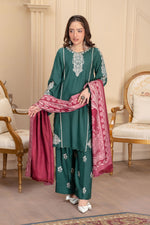 Silk Karandi Embroidered Shirt with embroidered sleeves, Neckline, and Daman with Embroidered Trousers and Printed Shawl.